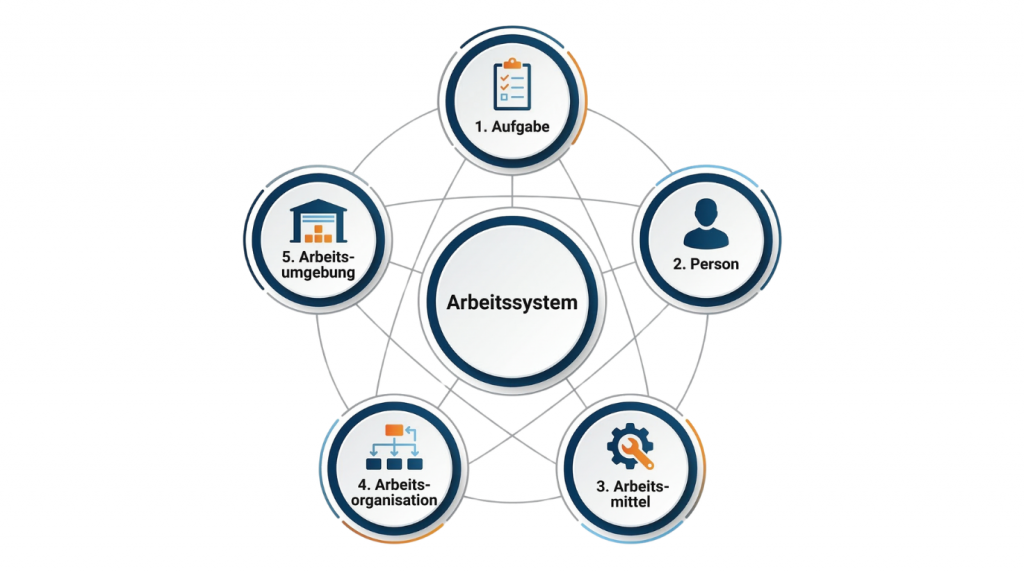 Der entscheidende Punkt dieses Modells: Diese Elemente wirken nicht unabhängig nebeneinander. Sie beeinflussen sich gegenseitig. Eine Aufgabe, die unter Normalbedingungen sicher ist, kann unter Zeitdruck (Arbeitsorganisation), mit unzureichendem Werkzeug (Arbeitsmittel) und in einer lauten Umgebung (Arbeitsumgebung) zur Gefährdung werden, auch wenn jedes Element für sich betrachtet unauffällig erscheint.