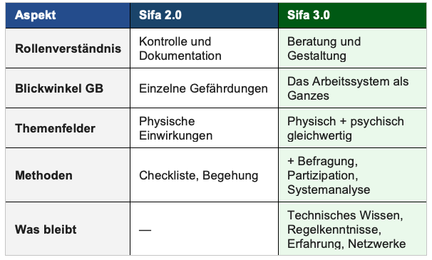 Das Rollenverständnis verschiebt sich. Die klassische Sifa prüft, kontrolliert, dokumentiert Mängel und gibt Empfehlungen. Die Sifa 3.0 berät, moderiert Prozesse, gestaltet Arbeitsbedingungen gemeinsam mit Führungskräften und Beschäftigten. Compliance erzeugt eine Sicherheitsorganisation. Beteiligung und echte Beratung erzeugen eine Sicherheitskultur.